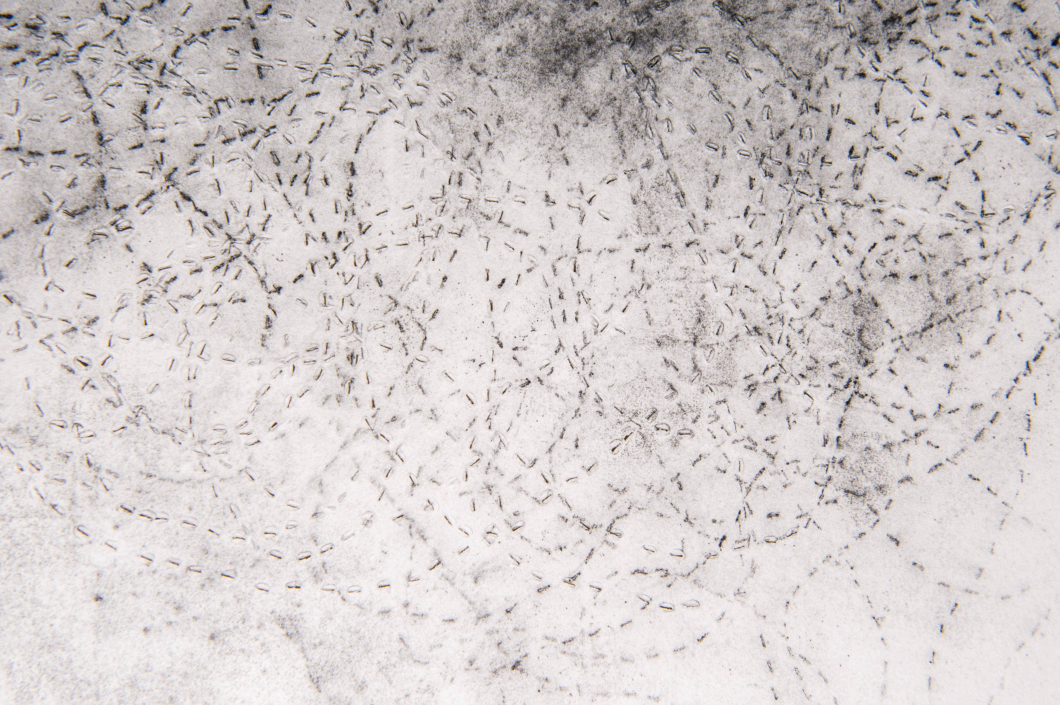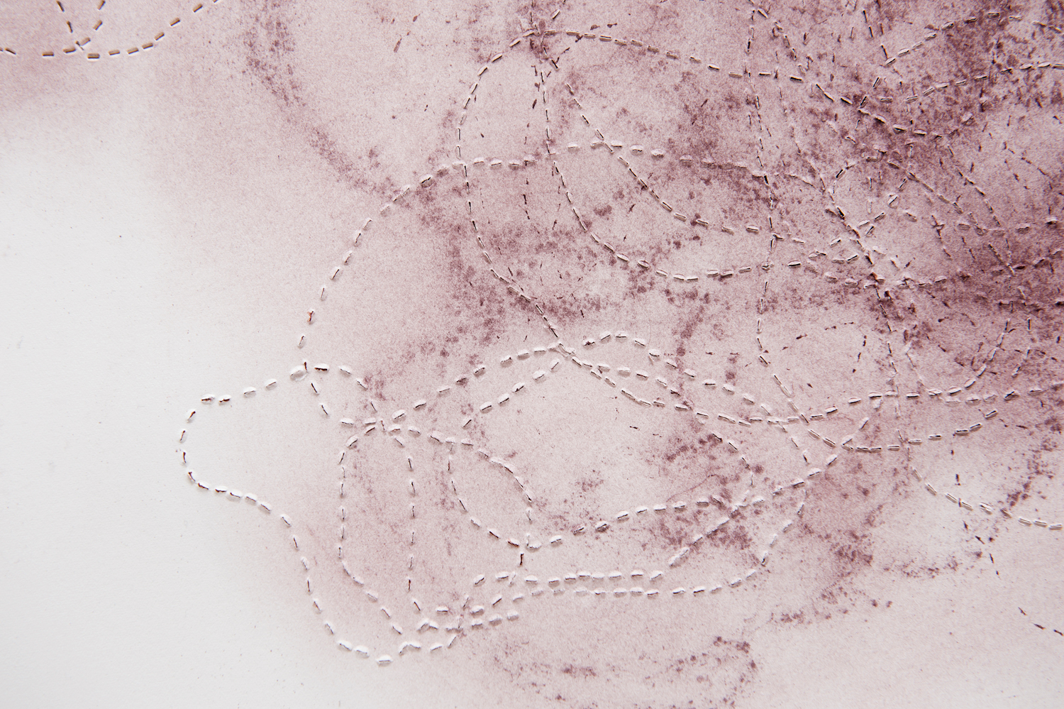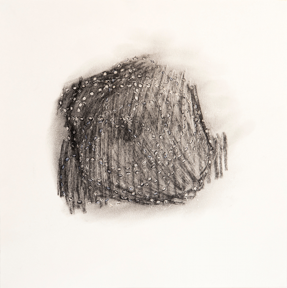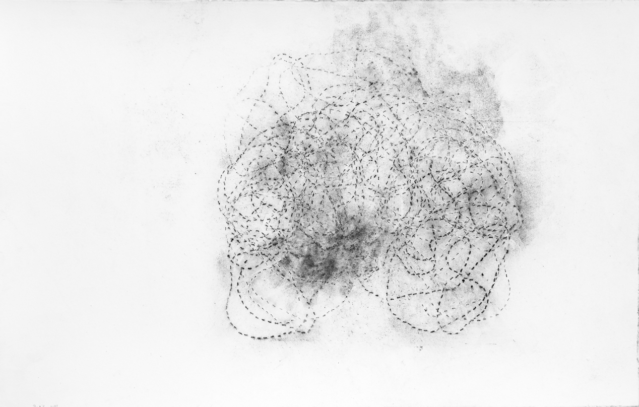De la poudre aux yeux : une série de dessins dont la réalisation doit beaucoup au poncif, à la fois en tant que technique qui permet de reporter un dessin piqué de trous sur un autre support au moyen d’une poudre qui reportait en pointillés les contours du dessin. Mais également au sens de l’usure d’une formule. Les répétitions du motif ou du nœud de 8 sont autant de tentatives d’épuisement. Le fusain pulvérisé, pris entre les couches, laisse son dépôt par frottements directs, par empreintes ou encore par la dispersion poudreuse engendrée au rythme des traversées du support. Les différentes couches, dont l’ordre (dessus / dessous) et sens (recto / verso) peuvent échanger leurs positions, sont tantôt utilisées comme poncif, tantôt comme martyr ou encore comme support de transfert : le poncif retourné, détourné, devient lui-même le support du dépôt résiduel. Ces tracés en pointillés sont ceux de l’arabesque d’une ficelle nouée en 8 fermée sur elle-même laissée tombée sur le recto ou le verso d’une feuille de papier. L’opération est répétée, elle en devient un motif en tant qu’elle mobilise sa double signification : à la fois par la répétition et par le mobile de l’action, son moteur où, derrière la raison de l’action, il ne faut pas oublier la dynamique de mouvement.