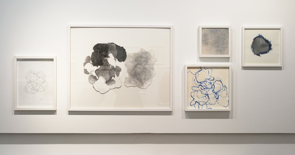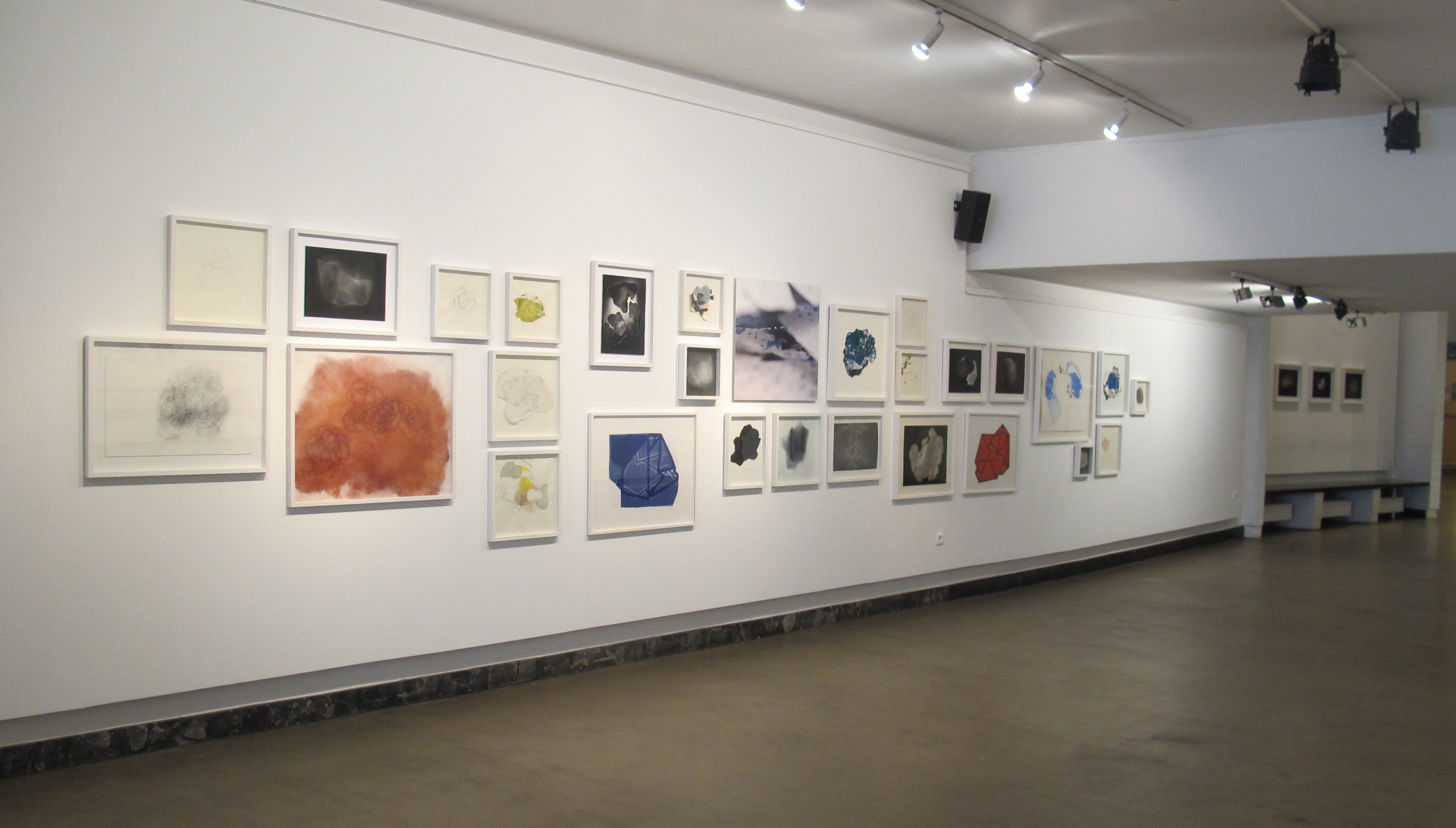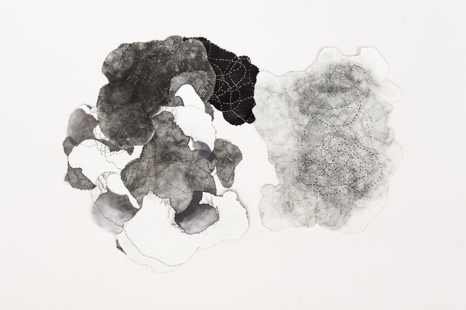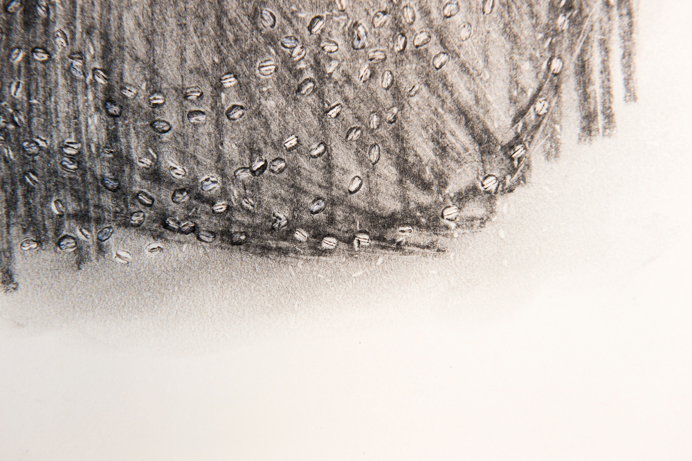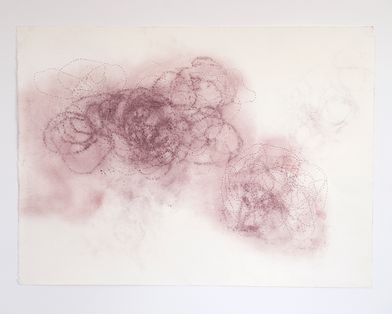 De la poudre aux yeux : une série de dessins dont la réalisation doit beaucoup au poncif, à la fois en tant que technique qui permet de reporter un dessin piqué de trous sur un autre support au moyen d’une poudre qui reportait en pointillés les contours du dessin. Mais également au sens de l’usure d’une formule. Les répétitions du motif ou du nœud de 8 sont autant de tentatives d’épuisement. Le fusain pulvérisé, pris entre les couches, laisse son dépôt par frottements directs, par empreintes ou encore par la dispersion poudreuse engendrée au rythme des traversées du support. Les différentes couches, dont l’ordre (dessus / dessous) et sens (recto / verso) peuvent échanger leurs positions, sont tantôt utilisées comme poncif, tantôt comme martyr ou encore comme support de transfert : le poncif retourné, détourné, devient lui-même le support du dépôt résiduel. Ces tracés en pointillés sont ceux de l’arabesque d’une ficelle nouée en 8 fermée sur elle-même laissée tombée sur le recto ou le verso d’une feuille de papier. L’opération est répétée, elle en devient un motif en tant qu’elle mobilise sa double signification : à la fois par la répétition et par le mobile de l’action, son moteur où, derrière la raison de l’action, il ne faut pas oublier la dynamique de mouvement.