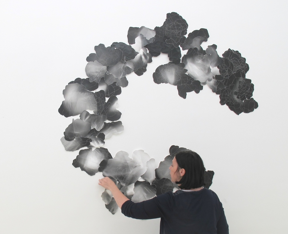 Amélie de Beauffort découpe les trajets sinueux des méduses et en recompose, elle mime les tentacules en créant des parcours pointillés qui semblent des points de couture mais ressortissent en fait à la perforation. Il faut en découdre. La ficelle n’attache pas, ne lie pas, elle tombe sur le support et indique un mouvement que l’artiste accepte de suivre, de reprendre. Les pointillés scandent une errance, ils tissent un réseau, laissent des marques matérielles et chargées de vide par-dessus les traces de lumière que sont les photographies dont le sujet/objet n’est que flottement et retournement de matière translucide scintillante.